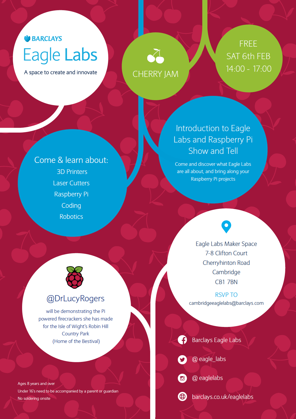 Dr Lucy Rogers is organising a maker/hacker/Raspberry Pi event at Eagle Labs, which is the new Maker Space in Cambridge. The event will take place between 2-5pm on Saturday, 6th February. Sponsored by Barclays, the Maker Space has lots of equipment to use to bring your projects to life. During the event, you’ll be able to learn more about the Space and also take part in various activities, including a Raspberry Pi show-and-tell. There is parking on site. If you’d like to attend, or get involved by bringing along your own projects, please email cambridgeeaglelabs@barclays.com to let them know you’re coming (there’s a limit of 50 people for the event).